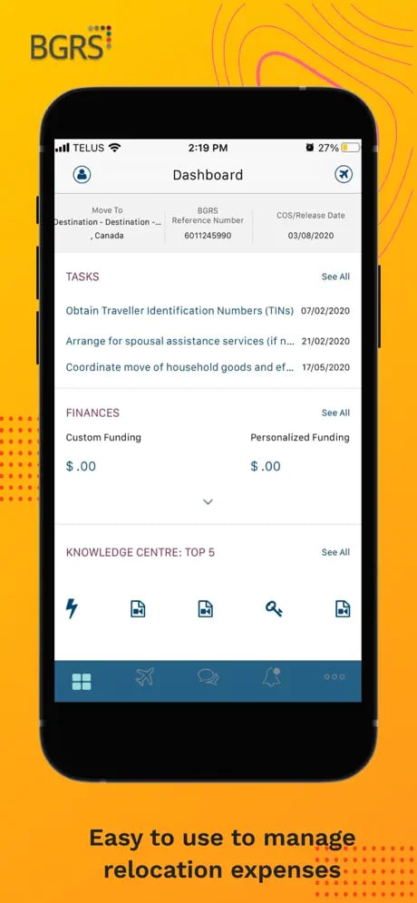 Access a suite of powerful tools like the Move Planner, Communications Hub, and Knowledge Center to stay organized and informed throughout your move. Manage expenses effortlessly by categorizing receipts, completing claims, and tracking costs directly from your device. Explore your new destination with map-enabled features pointing to schools, hospitals, restaurants, and more. Stay connected with direct access to BGRS contacts and suppliers, and manage tasks and messages in one secure, user-friendly platform.